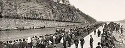 The Drive originated as the Harlem River Speedway,[4] which started construction in 1894[5] and opened in July 1898.[6] Originally, the Speedway was exclusively for the use of horse-drawn carriages and those on horseback; bicyclists were specifically excluded, as were sulkies and drays. The Speedway ran from West 155th Street to Dyckman Street, and soon became a tourist destination, where visitors watched carriage races and boat races on the river. Rich New Yorkers used the Speedway to train their horses and size up those of their friends and competitors.[4][7] In 1919, motorists were allowed on the Speedway, but for normal driving purposes.[7][8] The route was paved in 1922, and officially renamed the Harlem River Driveway.[7][9]