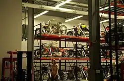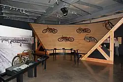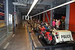 On the museum's upper level, a procession of motorcycles is displayed down the center of the main hall, running the length of the building, with galleries on either side.[5]