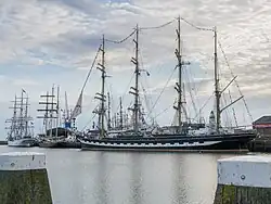Harlingen's port remained significant in the 19th century. Already in the 1820s, the Amsterdamsche Stoomboot Maatschappij made a stop at Harlingen part of her Amsterdam-Hamburg line. While this was later omitted, Harlingen would retain a steam powered line to Amsterdam. Steam powered ships opened some new opportunities, especially for the export of agricultural products to England. By 1846 this was very important for the Frisian economy and led to severe competition between the shipping lines.[13] After some time, the St. Petersburg Steamship Company came to dominate the export to London. The export of live cattle was much easier with steam boats and became important because cattle had to be slaughtered near the place of consumpton. By 1870 the General Steam Navigation Company (GSNC) also had a regular cattle line between London and Harlingen.[14] In April 1876 GSNC acquired the boats of the Petersburg Steamship Company and thus elimated this competitor.[15] In 1896 the route to Harlingen was one of GSNC's most profitable lines.[16] In the late 1890s, the GSNC ships on this line got cooling facilities.[17] This allowed the export of the famous Frisian dairy products, especially butter with even less damage during transport.