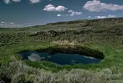 The basin was formed approximately 32,000 years ago when lava flows formed the Malheur Gap, separating the watershed of the basin from the Malheur River, a tributary of the Snake River. Archaeological evidence indicates the basin was inhabited as early as 10,000 years ago. Pollen records indicate that the climate, especially the level of rain and snowfall, has varied greatly since the end of the Pleistocene.[12] Evidence of prehistoric fishing techniques is found at several sites. Evidence suggests that there existed in the basin several species—in particular, the chiselmouth, coarse-scale suckers, and northern squawfish—that are currently found only in the Columbia River basin, indicating that at some point the Harney Basin may have been connected to the Columbia.[13] During wetter years, the lake level of Malheur Lake was raised to a depth of 25 feet (7.6 m), allowing the lakes to drain over the Malheur Gap. In modern times, however, the lake level does not rise above 10 feet (3.0 m) in the wettest years.