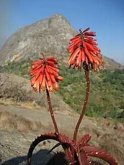In the center of the lawn, a large rock protruded above the ground and was unable to be removed despite much digging.[2][3] In 1916, Christian's farm surveyor went to a hill close by, uprooted an Aloe cameronii, and planted it "to hide the stark appearance of this unsightly rock".[2][3] When the plant flowered the next year despite no watering, Christian was so pleased that he decided to focus on gardening native African aloes instead of imported plants.[2][3] From 1916 on, numerous rockeries were constructed and more and more aloes were acquired for the garden.[1][2]