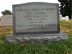 Bowen died 1 August 1965, at Our Lady of Fatima Hospital, Providence, Rhode Island.[13] His residence was in Cranston, Rhode Island at the time of his death.[17] He was interred 4 August 1965 at Arlington National Cemetery, section 4, grave 3188-B.[18] He was survived by his wife Edith Brownlie-Bowen and his son Harold G. Bowen Jr.[13]