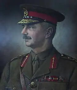 His next posting was as military secretary at the general headquarters (GHQ) of the British Expeditionary Force under the BEF's commander-in-chief (C-in-C), Field Marshal Sir Douglas Haig.[10][73] After harsh criticism of GHQ's performance during the 1917 fighting, several of Haig's senior staff had been replaced by new men like Ruggles-Brise brought in.[74][75][76] The military secretary was one of the C-in-C's closest assistants with particular responsibility for promotions and appointments. Ruggles-Brise arrived to take over from Lieutenant General Sir William Peyton[77] in the middle of the German spring offensive of March 1918, and one of his first jobs was to inform the commander of the BEF's Fifth Army, General Sir Hubert Gough – in the midst of organising a counter-attack – that he was being replaced.[78] Gough later recalled that Ruggles-Brise 'told me as nicely as he could'.[79]