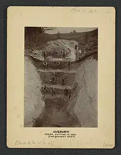 Gray excavated for five seasons between 1908 and 1922 at Avebury (1908, 1909, 1911, 1914 and 1922).[16][17] His discovery of over forty antler picks at or near the bottom of the henge ditch at Avebury proved that it had been dug out of solid chalk to a depth of 11 m (36 ft) using red deer antlers as picks.[18][19] Excavations at Avebury were sponsored by the British Academy and private donors.[18]