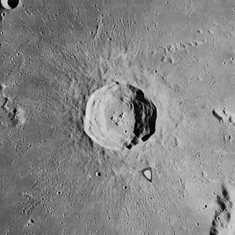 ![]() Lunar Orbiter 4 image (triangular mark below right of crater is blemish on original) | |