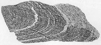 ![]() Harpers Schist. Shows older folded schistosity parallel to bedding cut by younger cleavage inclined to bedding. | |