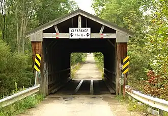 The Harrington Covered Bridge is 72 feet (22 m) long and carries Barney Road (State Route 3003) over Conneaut Creek. It was designed as single-span, multiple King post-truss bridge in 1870 by William Sherman, who also built the Gudgeonville and Carman covered bridges that were located nearby.[2] Like the other two covered bridges, it is clad in a unpainted, vertical wooden plank siding.