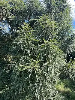 A dozen plants of the original population of Clematis marata – all male – are still present in the remnant kānuka stand,[16] and Coprosma intertexta has been propagated from the few remaining bushes on the Canterbury Plains and is spreading on the site. Kōwhai (Sophora microphylla) have been propagated from seed gathered in a nearby Rakaia River terrace, funded by a grant from Environment Canterbury, and several hectares have been planted in kōwhai savannah.[6] Matagouri (Discaria toumatou), native broom (Carmichaelia australis), and creeping pohuehue (Muehlenbeckia axillaris) are also present. Pasture grass is being replaced by self-seeded Poa cita and Festuca novae-zelandiae.[1]