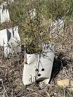Volunteer revegetation by Forest & Bird began in 2007 with the propagation and planting of 120 kānuka seedlings, but there was poor establishment on the dry, exposed site. The first public planting day in 2008 attracted 250 people, who planted 1000 seedlings supplied by the Department of Conservation nursery at Motukarara.[5] Over two days in the summer of 2009–2010 60 members of the public planted 1200 plants, including Coprosma, Melicytus, Muehlenbeckia, and more kānuka.[2]