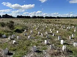 In 1962 Arthur and Shirley Harris purchased 121.4 ha of dry pasture at Maronan, 12 km southwest of the town of Ashburton. About 40 acres (16 ha) beside Lovetts Road was partly covered with low kānuka (Kunzea serotina) forest, matagouri (Discaria toumatou), and other native dryland species—referred to at the time as "scrub".[1] Locals would forage for firewood on the site, so in 1965 the Harrises requested the help of the council to flatten the scrub and dig up kānuka stumps with a road grader, arranging them in windrows for burning, as they began to turn it into pasture.[1][2] They retained and fenced 2.4 ha of kānuka around the perimeter of one paddock as shelter for lambing ewes, about 300 m away from Lovetts Road. Notably the land was never ploughed, instead being lightly grazed by sheep.[3]