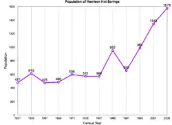 The population of Harrison Hot Springs grew from 1996 to 2006, when the Canadian Census reported 655 people in 1991, 898 in 1996, 1,343 in 2001, and 1,573 in 2006.[7][8][9] It has since receded slightly to 1,468 in 2011 and 2016.[4]