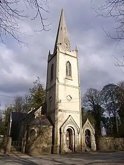 The church, a very neat edifice with a tower and spire, was built by the late John La Touche, Esq. and contains a tablet to the memory of Capt. Cooke, who fell while charging the insurgents at Kilcullen bridge, in 1798. The late Board of First Fruits granted £100, in 1810, towards the erection of a glebe-house, attached to which are 10 acres of glebe.[32]