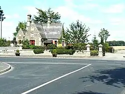 Between 1870 and 1890, the gate lodge at the Brannockstown entrance to the estate was constructed, according to the National Inventory of Architectural Heritage,[57] although the Dictionary of Irish Architects puts the date at 1864.[41] The gate lodge, in Byzantine style,[41] is "prominently sited to north-east of the crossroads and terminates the vista of the road leading into the village from the south-west".[57] The other gatelodge on the Harristown estate, to the north of the house at Carnalway crossroads, has not been reviewed yet by the NIAH as of 2025, nor has Harristown House itself.