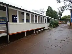 The manual training timber vocational building, Block L, was also extended to the north in 1959, with a new 24-foot (7.3 m) square classroom; and concrete steps and a flower box (latter not extant 2016) were added at the north end of the verandah.[59][60] In the same year a new section of covered walkway was constructed between the administration block and the west end of Block C, with the addition of a health services room at the west end of the upper floor of Block C, west of the stairs; and an Oslo lunch canteen to the south of, and separate from, the southwest corner of the ground floor of Block C.[61] The lunch canteen was initially built with three half-height brick walls (being open to the north) with fixed wired glass windows over (to the west, south and east) and the north side has since been enclosed.[62][1]