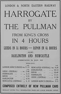 The Harrogate Pullman was introduced into service by the London and North Eastern Railway and began operating in 1923 between London King’s Cross and Newcastle, via Harrogate and Ripon.[1]