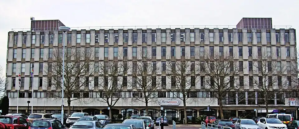 By the 1950s, Harrow was described as the "capital city of Metro-land".[31] The borough's council Civic Centre building complex was built in 1970–1972, opened 6 May 1973, on Station Road in Wealdstone.[32] Six storeys high and designed by architect Eric Broughton, the building is considered "outdated and costly" in 2018 and was expected to be imminently redeveloped.[33] Throughout the 1960s and 1970s, many new office blocks were built in the town, especially in Lyon Road and the western end of College Road.[24]