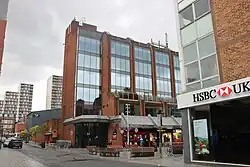The town centre has undergone a new wave of redevelopment. In 2011, the one-way single lane section of Station Road was widened to allow two-way bus traffic.[42] The 11 storey luxury apartments of Bradstowe House were completed in 2016 after long delays.[43] Former office buildings on Lyon Road (including Coal House, once belonging to the National Coal Board) have been regenerated into new mixed use buildings in the 2010s, whereas on Pinner Road behind St George's centre a new eight storey development called Trident Point was built which includes a Morrisons supermarket opened in 2013.[44] The former post-office sorting building on College Road, next to the train station, remained vacant for some years until plans for a 19-storey skyscraper were approved by the council in 2015. The development, called Harrow Square, was partly completed with 318 apartments across four buildings in 2018.[45][46] It includes a bottom floor 1,450 square metres (15,600 sq ft) library still under construction which will replace the current Gayton Library on St John's Road.[47][48] The building next to it, formerly First National House,[49] has been refurbished into luxury apartments called The Hub.[50]