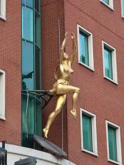 Nearby St Anns shopping centre, another indoor retail outlet was built which was opened as St George's Shopping and Leisure Centre on St George's Day in 1996. The town's Woolworths store on Station Road closed and was replaced by a new branch inside St George's.[37][38] Other landmarks built during the decade include the Hygeia building in 1991,[39] which has an erected golden coloured sculpture of Roman goddess Hygeia facing the bus station. Furthermore, in 1991, Lower Mead stadium on Station Road, the home of Wealdstone F.C., was sold to Tesco and demolished. In its place a new large Tesco superstore was built.[40][41]
