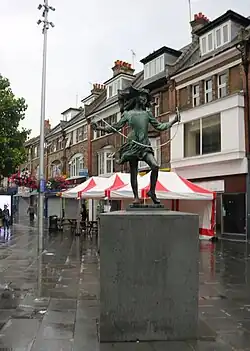 The town underwent regeneration in the 1980s with the building of a bus station in College Road and the pedestrianisation of St Anns Road. A statue called "Skipping Katie" was unveiled by the local council in May 1987 to celebrate the completion of the pedestrianisation. The landmark was designed by James Butler inspired by watching his daughter skip.[35] A plaque on Katie was unveiled in 2004 by Queen Elizabeth II and the Duke of Edinburgh to mark the 50th anniversary of the London Borough of Harrow.[35]