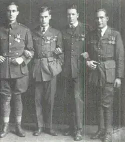 (L-R) Philip ('the Vulture") Shepley, Harry Crosby, George Richmond ("Tote") Fearing, and Stuart Kaiser shortly after Armistice Day, 1919, displaying their decorations