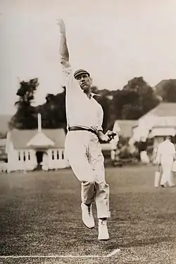 Dean was a left-arm bowler who could bowl fast-medium swing or slower spinners to suit the conditions. Joining Lancashire in 1906, he made an immediate impact with 60 wickets in his first season. He took 100 wickets in 1907 but was expensive given that virtually all pitches suited spin bowling. However, by developing fast-medium swingers of a similar style to George Hirst[1] as a dry-weather alternative to his slow-medium spinners, Dean improved steadily to be by 1910 clearly the best bowler in the Lancashire eleven with 137 wickets.[2] In 1911, although he was overworked when Walter Brearley was away on business, Dean went from strength to strength, taking 175 wickets in the County Championship and being by 23 wickets the leading bowler in first-class cricket[3] (and this in spite of often resting when the fast bowler was away from business). In the six games he did partner Brearley, the two gave enough evidence that they could be formidable indeed: against Kent on a perfect wicket at Canterbury they got down eight wickets for 58 at the start and went on to take all twenty wickets in the match – Brearley twelve for 218, Dean eight for 144[4] – depriving Kent of a hat-trick of titles in the process.