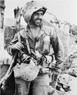 The battalion commander was killed, and soon afterwards, orders arrived to seek and destroy any enemy combatants around NaHa. On June 11, 1945, Kizirian was assigned the special task of patrolling to locate elements of an enemy reserve platoon.[20] His unit moved to attack Japanese soldiers entrenched along a ridge line. Through the smoke and dust, he noticed six stretcher bearers and a wounded Marine that were under heavy machine gun fire. Disregarding his own safety, Kizirian placed himself in the line of fire and single-handedly attacked the enemy emplacement. The Japanese Special Naval Landing Forces that confronted Kizirian shot him in the legs and abdomen. Unable to walk, he still managed to make his way forward using his elbows to a position where he was able to shoot and kill all 12 soldiers manning the machine gun.[9] Due to these actions, Kizirian was awarded the Navy Cross, the second highest medal in the United States military. The citation provides details about the event:[21][22]