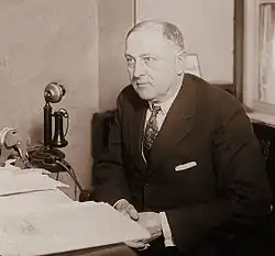 During the party split of 1912, Daugherty was a staunch supporter of Taft and old guard Republican conservatism against the progressive Republicanism espoused by Roosevelt.[30] Daugherty was a key figure on the ground in Ohio in behalf of the Taft campaign, issuing a major address on May 18 which was so well regarded that it was reproduced as a pamphlet by the Taft organization.[31] Although Daugherty's machinations along with Cuyahoga County boss Maurice Maschke carried the state Republican convention for Taft, a split of the Republican field in the November election propelled Democrat Woodrow Wilson to the presidency with a plurality of under 42% of the vote.