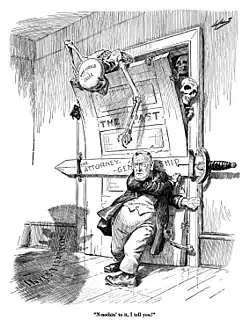 In the aftermath of the caucus that would determine Ohio's U.S. Senator, editorials of the Democratic Columbus Post charged that Daugherty and fourteen other Ohio legislators had changed their support from Foraker to Sherman based upon "intimidation, threats, promises, and actual purchase" and accused Daugherty by name of having accepted cash payments.[10] A formal investigation of this charge by a bi-partisan four member committee of the Ohio State Senate followed, with Daugherty being unanimously cleared of all charges in a report issued in April 1892.[11]