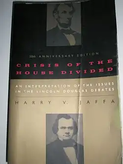 Jaffa wrote on topics ranging from Aristotle and Thomas Aquinas to Abraham Lincoln, Winston Churchill, and natural law. He was published in the Claremont Review of Books, the Review of Politics, National Review, and the New York Times. His most famous work, Crisis of the House Divided: An Interpretation of the Issues in the Lincoln-Douglas Debates, written in 1959, has been described as a touchstone.[7][8] He wrote the controversial line in 1964 Republican presidential nominee Barry Goldwater's acceptance speech that "extremism in the defense of liberty is no vice".[9][10]