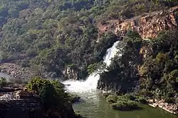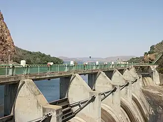 Hartbeespoort Dam (also known as Harties) is an arch type dam situated in the North West Province of South Africa. It lies in a valley to the south of the Magaliesberg mountain range and north of the Witwatersberg mountain range, about 35 kilometres north west of Johannesburg and 20 kilometres west of Pretoria. The name of the dam means "dam at the gorge of the hartebeest" (a species of antelope) in Afrikaans. This "poort" in the Magaliesberg was a popular spot for hunters, where they cornered and shot the hartebeest.[2] The dam was originally designed for irrigation, which is currently its primary use, as well as for domestic and industrial use.[3] The dam is considered to be in a hypereutrophic state since the early 1970s. Mismanagement of waste water treatment from urban zones within the Hartbeespoort Dam catchment area is largely to blame, having distorted the food web with over 280 tons of phosphate and nitrate deposits.[4]