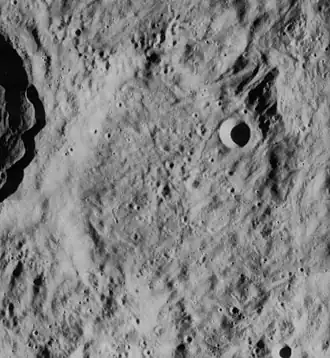 This crater lies within the outer blanket of ejecta that surrounds the Mare Orientale impact basin, and its form has been modified by this material. Much of the eastern rim of the crater is overlaid by this ejecta, and only a portion of the western rim near Schluter remains well-formed. The interior floor has likewise been modified. There is a small crater on the floor near the northeastern rim.