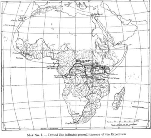 The Harvard Medical African Expedition of 1926–1927 was an eight-man venture sent by Harvard University for the primary purpose of conducting a medical and biological survey of Liberia; the secondary purpose being to then cross Africa from coast to coast - west to east - through the Belgian Congo (and other regions) so as to make a comparative study of their Liberian findings.[1][2] Furthermore, the Liberian interior was next of kin to being terra incognita in the West, there having been no previous medical or scientific survey of the region, nor any recorded expedition into the Liberian hinterlands.[1] The Expedition leader was Richard Pearson Strong (Harvard's first Professor of tropical medicine),[3] with the others being zoologists Harold Jefferson Coolidge Jr. (Assistant Curator of Mammals at Harvard) and Dr. Glover Morrill Allen, entomologist Dr. Joseph Charles Bequaert, botanist and Washington University in St. Louis Professor David H. Linder, bacteriologist Dr. George C. Shattuck, bacteriologist Dr. Max Theiler, and Assistant Ornithologist Loring Whitman (also a Harvard medical student and photographer).[4][1] The Expedition was a success and, while its "chief objective was the investigation of tropical diseases, many zoological specimens were collected and the customs of the native tribes were studied."[5] The story of their travels back and forth across Liberia, and reports of the diseases found that ailed the inhabitants, animals and plants was published in the two-volume The African Republic of Liberia and the Belgian Congo: Based on the Observations Made and Material Collected during the Harvard African Expedition, 1926-1927 written by Dr. Strong in a partnership with other Expedition members and Harvard officials.