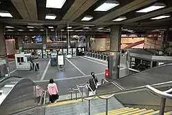 View looking northward from station atrium lobby, with outbound platform above inbound platform -