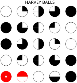 Harvey balls are round ideograms used for visual communication of qualitative information. They are commonly used in comparison tables to indicate the degree to which a particular item meets a particular criterion.