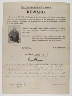 In 1947 Salameh re-emerged as second-in-command of the Army of the Holy War, a force of Palestinian irregulars in the 1947–48 Civil War associated with Grand Mufti al-Husseini.[13] The force has been described as Abd al-Qadir al-Husayni's "personal" army.[14] Salama had retrieved Nazi arms that had been hidden in the Egyptian desert during WWII, and on December 8, 1947, used them to attack Tel Aviv's Hatikva Quarter.[15] Haganah had prior information and were expecting the attack. After three-hour battle Palestinians retreated, Salama lost about one hundred men killed.[16] The mufti assigned Salama to the Lydda district, the appointment acknowledged by the Military Committee of the Arab league, however after Jaffa's commander Al-Hawwari, who was appointed at December 1947, had openly met with Haganah intelligence service officers to discuss cease-fire, Al-Hawwari was abolished from Jaffa.[17] At January 22, Salama had arrived at Jaffa commanding forty Bosnian Yugoslavian troops, who were experienced soldiers familiar with preparing, using explosives and building fortifications, probably veterans of the Muslim division of Waffen SS recruited by the mufti for Nazis. Salama remained in Jaffa for ten days.[18] Salama was partially successful in organizing militia of five hundred men from the armed groups active in Jaffa, though some joined "only nominally".[17] At a meeting held in Damascus on 5 February 1948, Salama was removed from Jaffa by the Military Committee of the Arab league and his assignment to the Lydda district was reconfirmed.[19][20] As a regional commander Salame organised activity along the roads in his region[21] along Al-Ramla - Jaffa road.[22] About five hundred Bosnian volunteers joined Salama and Abd al-Qadir al-Husayni ranks.[23] Salama may have known Bosnian Waffen S. S. 13th Handžar (’Knife’) veterans who joined from his training in Germany during World War II.[24] Foreign volunteers were important part of Salama force, since local Arabs avoided taking part in fighting.[22] For instance, Salama had to use foreign volunteers to carry out an attack he planned on Jewish transport to Rishon Letzion, since Bayt Dajan residents refused to help him.[25] During March 1948 Haganah intelligence had learned that Salama together with Iraqi commander of Al-Ramla established command headquarters in a four-storey building near al-Ramla. On April 5, Givati Brigade's company infiltrated and destroyed the compound, 25 Arabs were killed. Salama was not harmed, however his escape was deemed "disgraceful". However Salama returned to the destroyed building, retrieved the equipment and established his new command headquarters at Yehudia village.[26] There are reports that Salama used ex-Nazi advisors in his fight in Palestine.[27]