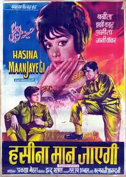 Hasina Maan Jayegi (lit. 'The Beauty Will Agree') is a 1968 Hindi film directed by Prakash Mehra. The film stars Shashi Kapoor, Babita, Ameeta, Yunus Parvez and Johnny Walker. The film's music, composed by Kalyanji Anandji, has songs which are quite memorable, with the melodious Rafi-Lata duet "Bekhudi Mein Sanam" being the most popular of them all. The film stood 9th in Box office collection for the year 1968. Shooting of the film started with the song "O Dilbar Janiye" at the now defunct Roop Tara studio.