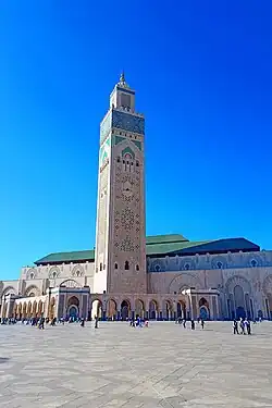 The Hassan II Mosque (Arabic: مسجد الحسن الثاني) is a mosque in Casablanca, Morocco. It is the second largest functioning mosque in Africa and is the 14th largest in the world. Its minaret is the world's second tallest minaret at 210 metres (689 ft).[2][3] Completed in 1993, it was designed by Michel Pinseau under the guidance of King Hassan II and built by Moroccan artisans from all over the kingdom. The minaret is 60 stories high topped by a laser, the light from which is directed towards Mecca.[4] The mosque stands on a promontory looking out to the Atlantic Ocean; worshippers can pray over the sea but there is no glass floor looking into the sea. The walls are of hand-crafted marble and the roof is retractable. A maximum of 105,000 worshippers can gather together for prayer: 25,000 inside the mosque hall and another 80,000 on the mosque's outside ground.[3]