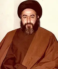 Because of this poem, al-Shirazi began to face pressures from the Baathists, that led to his immigration to Lebanon in 1964. Whilst in Lebanon, he founded Dar al-Sadiq, a publishing house that produced many Islamic books. He then returned to Iraq, before Abd al-Salam Arif 's death.[7] He continued his activism, against Abd al-Salam, his brother Abd al-Rahman, and later the Baathists, who assumed full control with a bloodless coup against Abd al-Rahman.[9] When Iranian religious exile Ruhollah Khomeini settled in Najaf in October 1965, he developed a close relationship with him and his son Mostafa.[10] The Baathists imprisoned al-Shirazi in 1969, and tortured him along with a number of other scholars in the Nihahya Palace. Due to the intensity of the torture, he was transferred to the military hospital, and then to a prison in Baqubah. He was released that same year, and shortly after, in 1970, immigrated to Lebanon as a result of Mostafa Khomeini's suggestion.[10] At first he sought treatment for the injuries he suffered under the torture of the Baathists. Then he resumed his activism, visiting many countries, and publishing more books and poetry.[7] His goal in Lebanon was to find both individual and institutional supporters.[10]