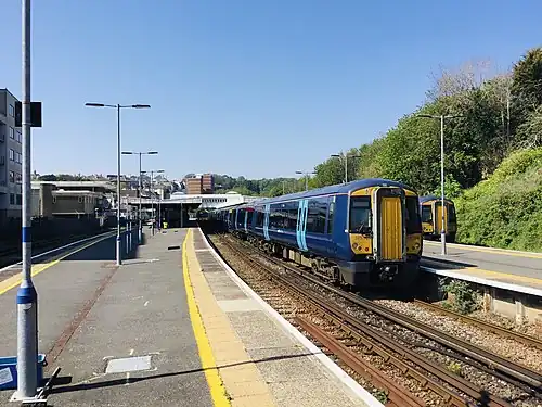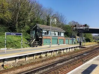 Hastings railway station is the southern terminus of the Hastings line in the south of England and is one of four stations that serve the town of Hastings, East Sussex. It is also on the East Coastway line to Eastbourne and the Marshlink line to Ashford International. It is 62 miles 33 chains (100.4 km) from London Charing Cross measured via Chelsfield and Battle; and 82 miles 33 chains (132.6 km) from Charing Cross via Chelsfield and Ashford.[1]