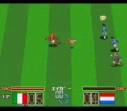 Most of the text is in Japanese, including the players' surnames. Eight different players can become the captain of the player's team and the team can use one of five different formations (4-4-2, 4-3-3, 3-5-2, WM and libero).[4] All of the formations are used in modern-day soccer except for the WM formation (which saw common use in England during the 1930s). The star player (captain) chosen kicks a shot (super shot or hyper shot) that pushes the goalkeeper into the stands, just like in Hat Trick Hero. Exhibition, world league (similar to a World Cup tournament) and Taito Cup (24 teams to beat) are the three possible variations in the game. After beating all the 23 national teams in the Taito cup mode, there is a final game against a team with the abbreviation "NLC". Mode 7 graphics give the game a sense of perspective.[4]