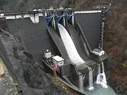 The potential of the Ōi River valley for hydroelectric power development was realized by the Meiji government at the start of the 20th century. The Ōi River was characterized by a high volume of flow and a fast current. Its mountainous upper reaches and tributaries were areas of steep valleys and abundant rainfall, and were sparsely populated. Design work began in 1902 by the Japan Electric Generation and Transmission Company (日本発送電株式会社, Nippon Hassoden K.K) and the first dam on the Ōi River (the Tashiro Dam) was completed in 1927. Further work was suspended by the Great Depression of the 1930s, and World War II in the 1940s. However, by the early 1950s, Japan’s need for electrical energy was growing exponentially. The Ōigawa Railway Ikawa Line was expanded to facilitate dam construction, and the newly created Chubu Electric Power Company received a loan from the United Nations Bank for Reconstruction and Development on September 10, 1958 to fund the project. Construction was completed by December 1961, and the system came into operation in early 1962.