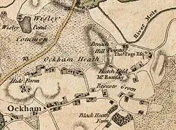 The name of the hamlet appears to have changed over time. A deed dating from 1740 refers to a John Wilson of 'Hatchfold'.[1] It also appears on Rocque's Map of Surrey of 1765 and Cary's 1786 map as 'Hatch Fold'.[2][3] It was still 'Hatchfold' in the Ordnance Survey map of 1816.[2] However, by the time of Brayley's 1848 Topological History, it had become 'Hatchford'.[4] Early maps and references to the area relate principally to the historic house that is now called 'Hatchford Park', but which was at earlier times referred to simply as 'Hatchford'.[4] As the hamlet grew in the late nineteenth century, however, the name was applied more broadly, with the historic house taking the name 'Hatchford Park' to distinguish it.[2]