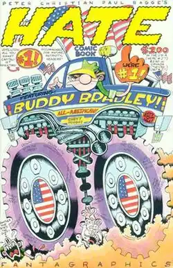 Hate is a comic book by writer-artist Peter Bagge. First published by Fantagraphics in 1990 it ran for 30 issues, and was one of the best-selling alternative comics of the 1990s, at its height selling 30,000 copies an issue. In 2000 Bagge revived the series in Hate Annual, a yearly comic that continues the story after Hate in short stories, and includes writings on libertarianism, culture, and topical cartoons.