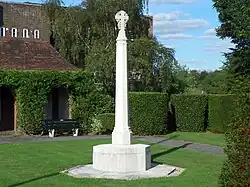 The central wheel-headed Latin cross is decorated with roses and lilies representing England and France. It stands on an octagonal shaft and simple octagonal plinth, surrounded by a small octagonal pavement, in the centre of a grass lawn. A rectangular pavilion constructed of red brick stands to the north side of the garden, with three round-headed arches facing towards the cross in the south; the arches were later closed by metal railings. The hipped roof of the pavilion is covered with clay tiles, and the brick floor is laid in a herringbone pattern. The solid side and rear walls bear stone plaques with dedications and lists of names. Baker used similar brick shelters at other memorials, including some for the CWGC on the Western Front.