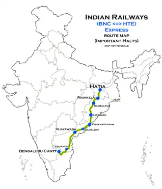 The Hatia–SMVT Bengaluru Weekly Express is an express train belonging to South Eastern Railway zone, that runs between Hatia and Sir M. Visvesvaraya Terminal in India. It is currently being operated with 18637/18638 train numbers on a weekly basis.[1][2][3]