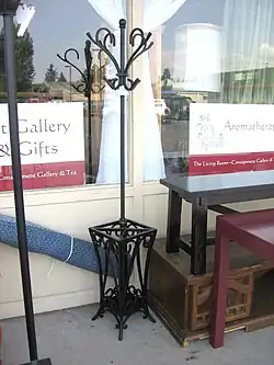 A hatstand is a device used to store hats and often coats on, and umbrellas within. Usually made of wood and standing at least 150 cm (5 ft) tall, they have a single pole making up most of the height, with a sturdy base to prevent toppling, and an array of lengthy pegs at the top for placement of hats. The complicated shapes of the spindles and hooks of both varieties create an interesting pattern on the wall.[1]