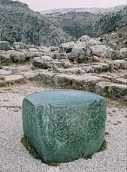The remains of at least thirty-one temples survive at Hattusa, which itself covers 268.46 hectares (663.4 acres).[1] One of these, called by archaeologists "the Great Temple" and "Temple 1", stands on a raised platform measuring 65 by 42 metres (213 by 138 ft).[2][3] This is believed to have been for the worship of the Sun-goddess and the Storm-god Tarḫunna, due to their importance to the Hittites and the stone bases of statues which survive. The Green Stone was found in a small room of the temple at the southern end of the street leading from the gateway. It remains there, open to the weather.[3][4] By comparison with the door sills, the stone now sits below ground level, suggesting that this was not its original position.[5]