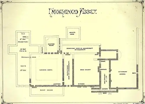 The Haughmond Abbey buildings, like those at Lillsehall, show signs of Cistercian architectural influence.[56] The standing remains are of white sandstone rubble construction with ashlar dressings. At the highest points, floors and lower walls were made by shaping the red sandstone that underlies the site.[97] Most of the buildings were grouped around two cloisters. They include: the foundations and west cloister doorway of the late 12th- and early 14th-century church; the late 12th-century chapter house (which is still roofed); the west wall of the warming house and dorter; the walls of the frater and its undercroft; and the early 13th century infirmary, flanked by the abbot's lodging to the east. Apart from a few walls, little else has survived from the western side of the site and, at the northern edge, the abbey church has completely disappeared – although the cruciform ground plan is still clearly visible.
