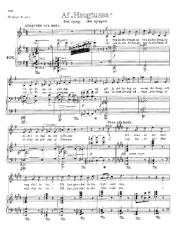 Haugtussa, Op. 67, or The Mountain Maid, is a song cycle for soprano and piano composed by Edvard Grieg in 1895 and published in 1898. Even though Grieg wrote a total of 181 songs,[1] this is the only song cycle in his entire output.[2] The text was written by the Norwegian writer Arne Garborg,[3] an excerpt from his book of poetry Haugtussa. It tells the story of Haugtussa, a young herding girl, and her first love affair with a boy, her first heartache. Both the lyrics, which brim over with imagery of gurgling brooks and tasty blueberries, and the music that mimics this imagery, intertwine the main character’s personal story and the mystic spring-like landscape that surrounds her, which may even motivate it.