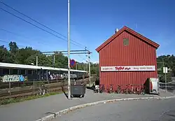 Freight traffic to Hauketo was limited and mostly served a building materials outlet located at the station.[6] The cargo annex of the building received an upper story with an apartment in 1967.[7] The cargo handling was discontinued during the 1970s, and the ramp and cargo annex were both demolished.[3] The station became unstaffed on 29 September 1980, losing the ticket office.[8] The station building was later converted to a pizzeria. The station area was gradually redeveloped and received bus station.[6]